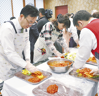 「韓日キムジャン祭り」と銘打ったイベントには民団関係者や神奈川県議会日韓親善議員連盟の議員ら約60人が参加。呉(オ)永錫(ヨンソク)キムチ博物館館長による解説と料理研究家の柳(ユ)香姫(ヒャンヒ)さんの実演後、参加者は唐辛子などを混ぜてつくられたヤンニョン(たれ)を白菜の葉1枚1枚に塗り込んだ。