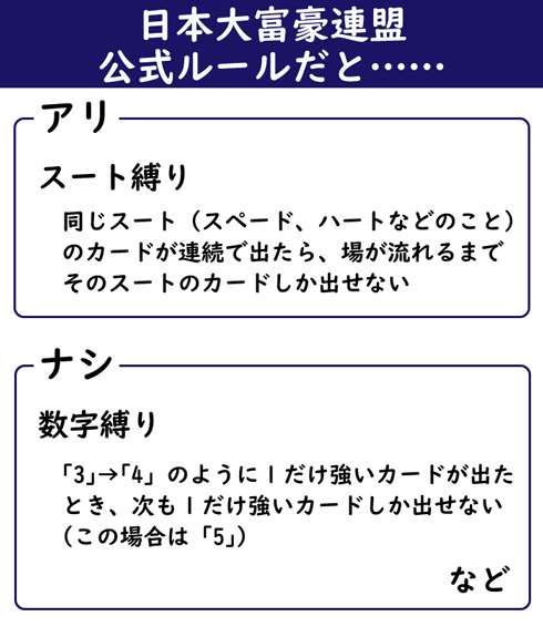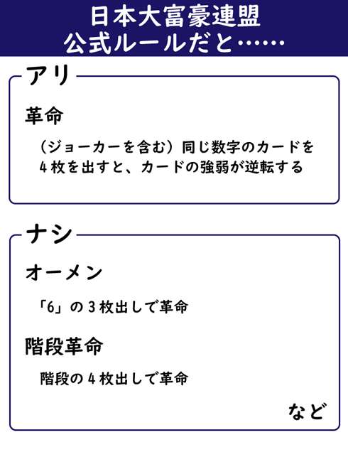 こういったローカルルールの煩わしさを解消するヒントになりそうなのが、「日本大富豪連盟」が採用している「連盟公式ルール」。大富豪の大会を行っている組織で、連盟公式ルールは「数多くある地方ルールの中から厳選」した結果、生まれたものだとしています。一体、何がアリで、何がナシなんです?