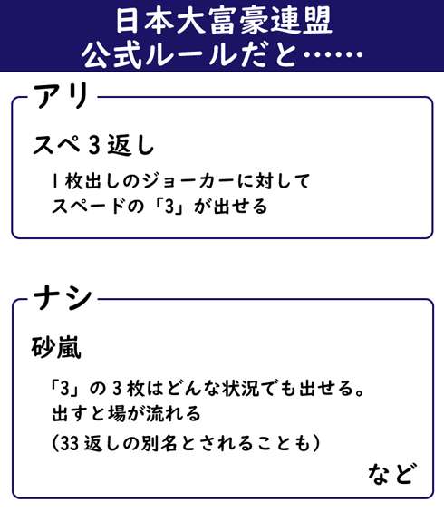 ・スペ3返し:通常、「3」は最弱のカードだが、1枚出しのジョーカーに対してスペードの「3」が出せる