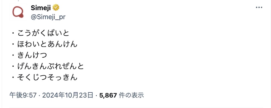 きせかえ顔文字キーボードアプリ「Simeji」の公式Xアカウントは10月23日、多発する“闇バイト事件”を受け、特定のキーワードを入力すると注意喚起が出る機能を実装したと発表しました。